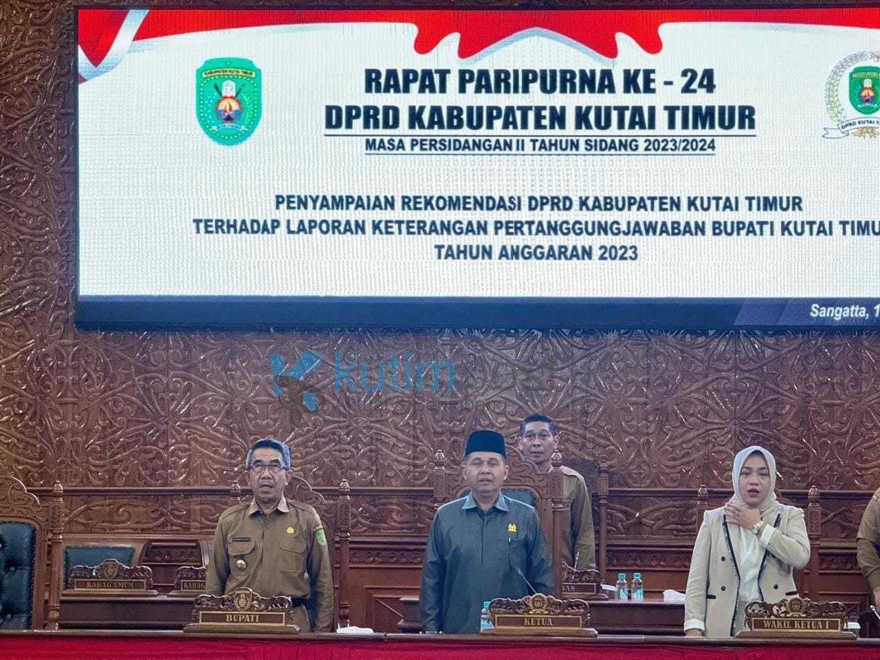 KUTIMPOST.COM, Sangatta – DPRD Kutim Gelar Rapat Paripurna ke-24. Dewan Perwakilan Rakyat Daerah (DPRD) Kabupaten Kutai Timur (Kutim) mengadakan Rapat Paripurna ke-24 yang membahas Penyampaian Rekomendasi DPRD Kutim terhadap Laporan Keterangan Pertanggungjawaban (LKPJ) Bupati Kutim Tahun Anggaran (TA) 2023.