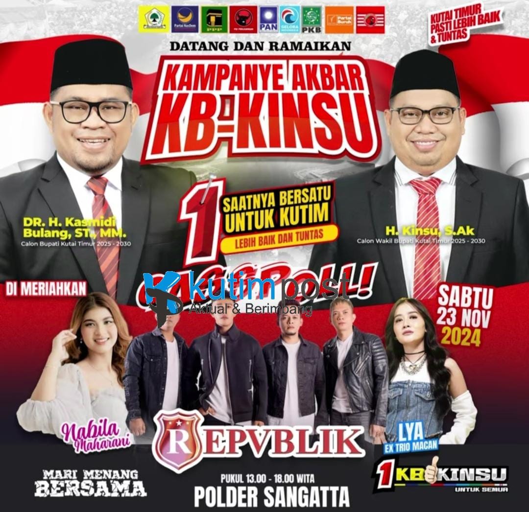 KUTIMPOST.COM, Sangatta – Kampanye Akbar KB-Kinsu Hadirkan Artis Ruri Repvblik, Nabila Maharani dan Eks Trio Macan. Masyarakat Kutai Timur (Kutim) ayo hadir dan saksikan pelaksanaan kampanye akbar pasangan nomor urut 01 Kasmidi Bulang-Kinsu (KB-Kinsu) yang diselenggarakan di Kawasan Polder Ilham Maulana pada Sabtu (23/11/2024) pukul 13.00 WITA hari ini.