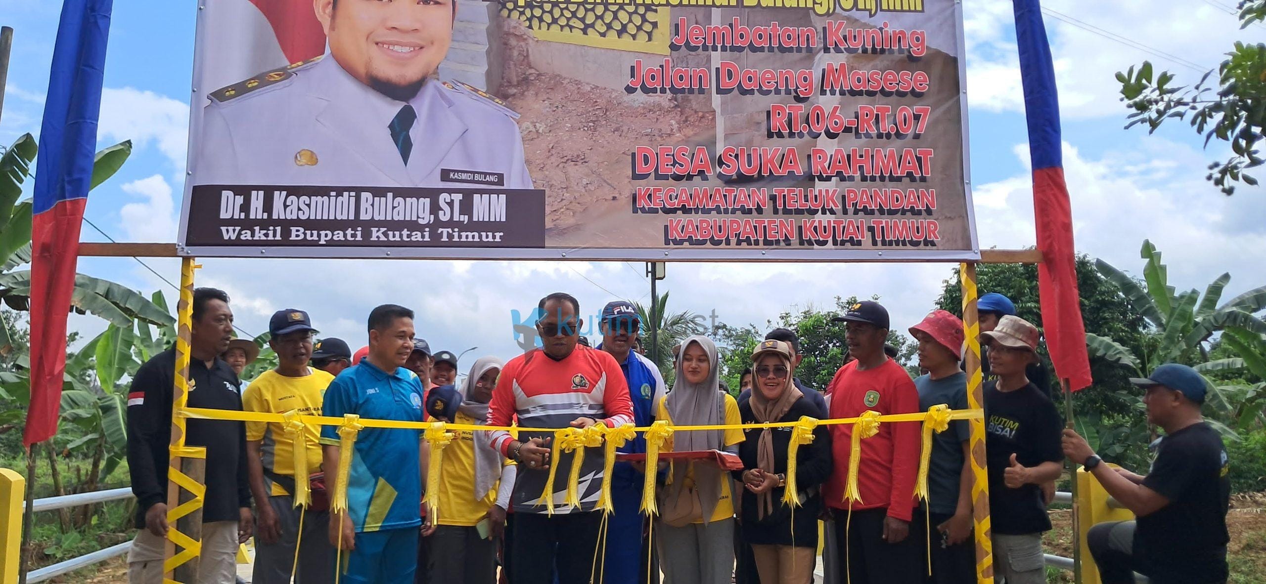 KUTIMPOST.COM, Sangatta – Wakil Bupati Kutai Timur (Kutim), Kasmidi Bulang, meresmikan Jembatan Kuning yang menjadi jalan penghubung antara RT 6 dan RT 7 Desa Suka Rahmat, Kecamatan Teluk Pandan, Minggu (11/8/2024).