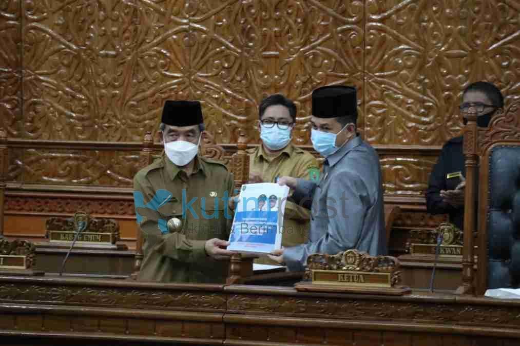 Bupati Kutim Ardiansyah Sulaiman Saat Menyerahkan Laporanya Kepada Ketua DPRD Kutim Joni, S. Sos., di ruang utama DPRD Kutim pada rapat paripurna ke 7. Kutimpost.com