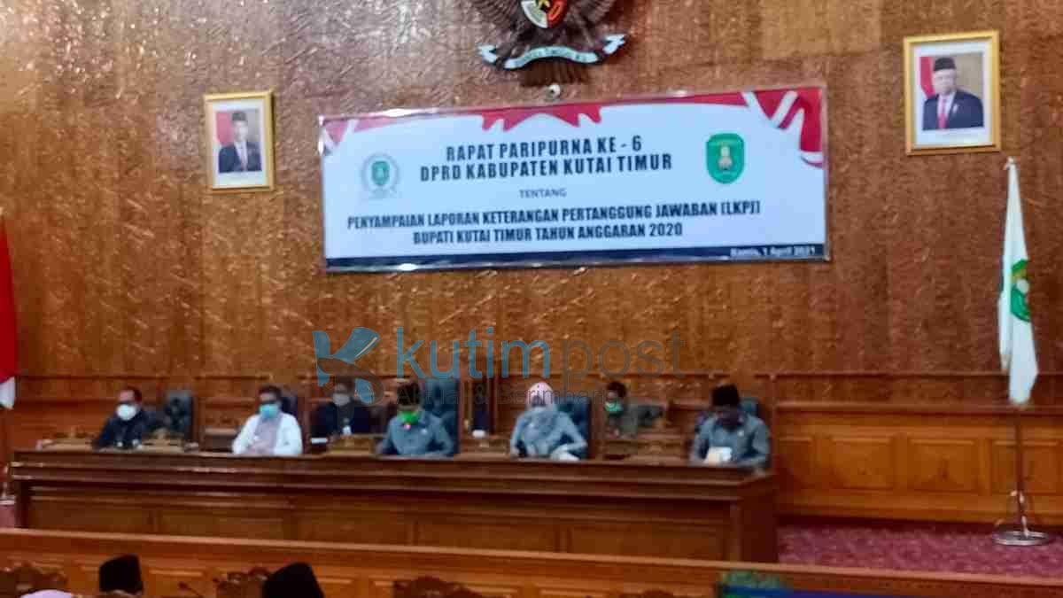 SANGATTA, KutimPost.com. – Rapat paripurna Ke 6 DPRD Kutai Timur, dengan agenda Penyampaian Pemandangan Umum Fraksi terhadap Nota Pengantar Rancangan Awal RPJMD Kutai Timur 2021-2026, berlangsung di ruang sidang utama Gedung DPRD Kutim. Rabu, (21/4/2021).