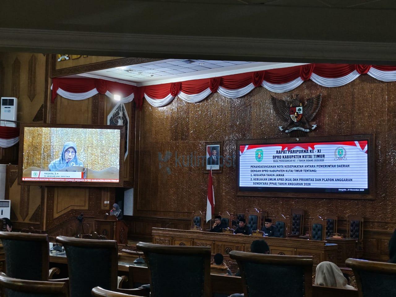 SANGATTA – DPRD Kutai Timur menggelar Rapat Paripurna ke-11 Masa Persidangan I Tahun Sidang 2025-2026 dengan agenda penyampaian laporan Badan Anggaran terkait penyusunan Kebijakan Umum Anggaran dan Prioritas Plafon Anggaran Sementara (KUA-PPAS) Tahun Anggaran 2026.