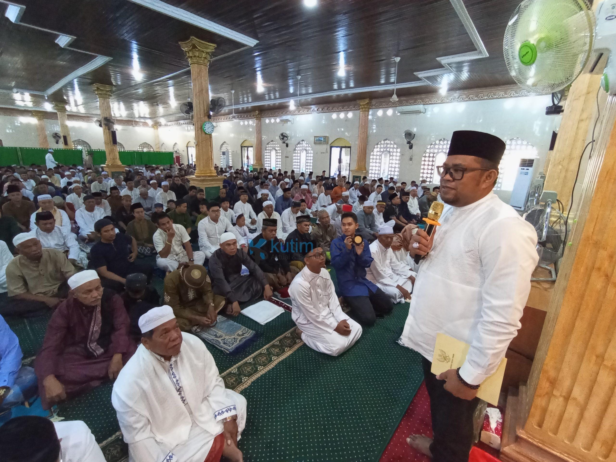 SANGATTA – Wakil Bupati Kutai Timur (Kutim), Kasmidi Bulang, membacakan pesan dari Bupati Ardiansyah Sulaiman usai melaksanakan Sholat Idul Fitri 1445 Hijriah di Masjid Al-Farouk, Kecamatan Sangatta Selatan, Rabu (10/04/2024).